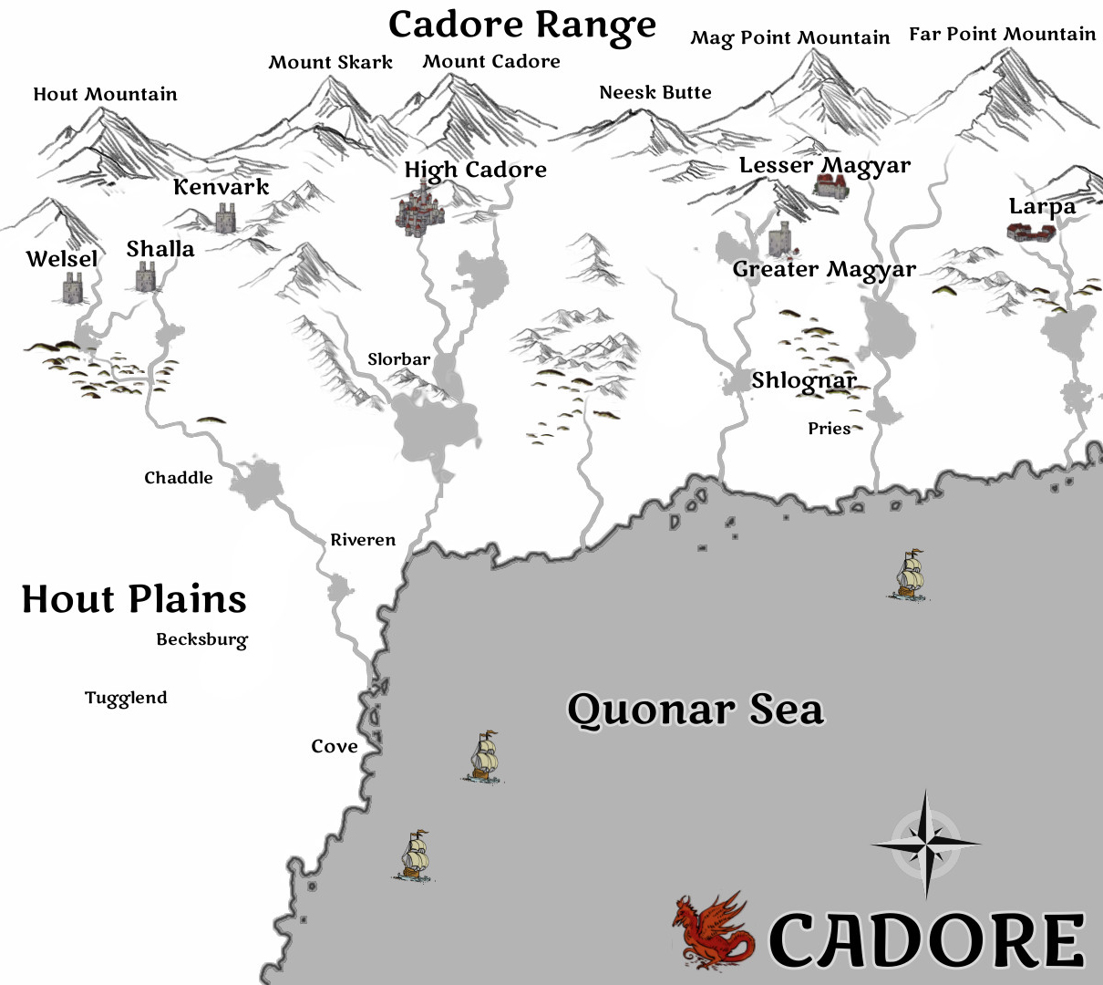 The Cadore Range is home to eight kingdoms. They are each unique, having different ruling styles, and separated along the range. Some have long histories of interactions while others maintain their isolation.