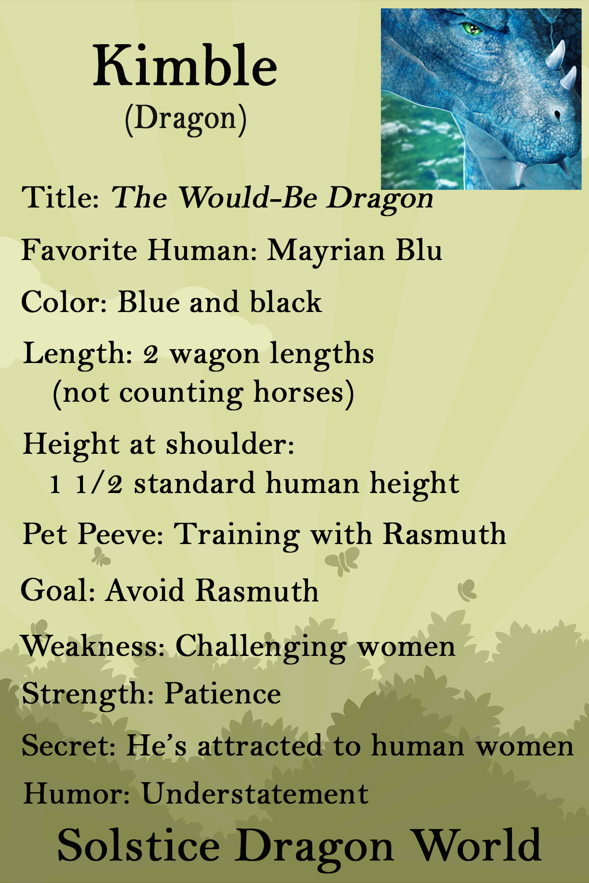 Kimble: a dragon with a tendency to flirt with human woman. He knows he needs to get over his fascination with humans if he's to live a normal dragon life.