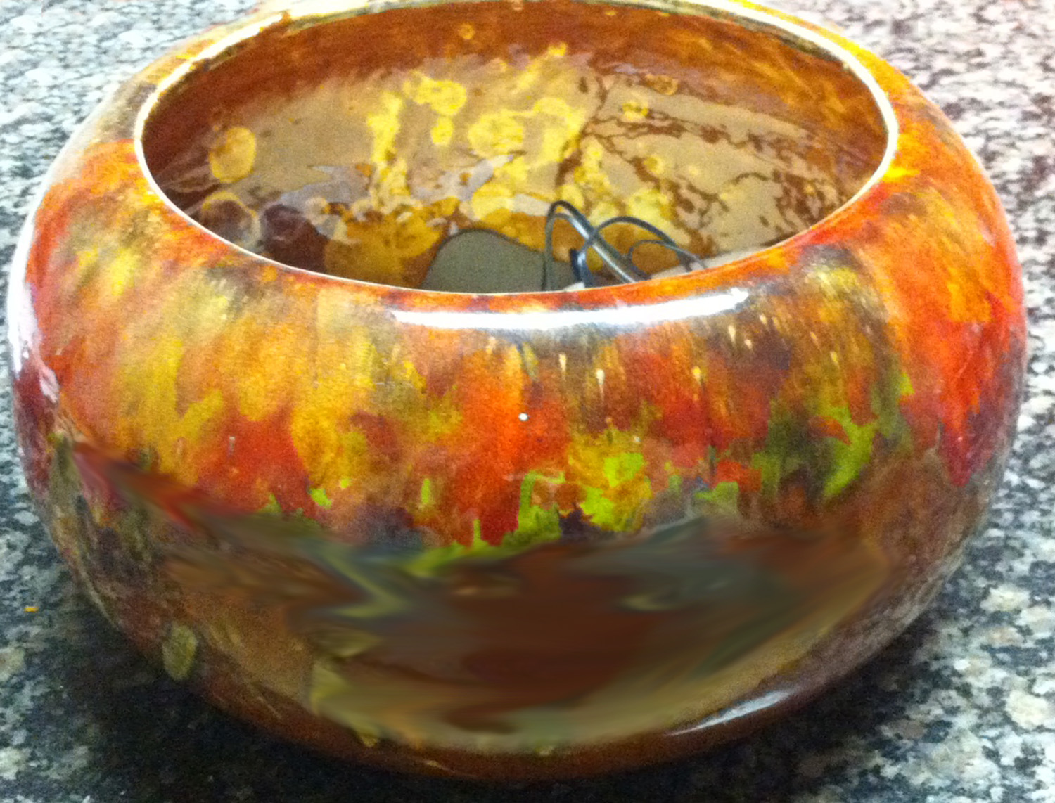 Now there is a glazed clay bowl on the center of my kitchen table. It’s squatty, round, about twenty inches in diameter with a variegation of colors: vibrant reds, pulsing oranges, mossy greens, and lots of browns. Several years ago I was visiting my mother and she offered me the bowl. She didn’t want it any more, and I was afraid to say no about taking it, worried she would take it as a condemnation of her decorative style. But then again she didn’t want it any more and what did that say? But I did take it. It sat beneath the open island in my kitchen and became the catch all for plastic bags from the grocery store until we could recycle them. A rather ignominious use for it.